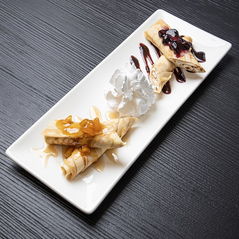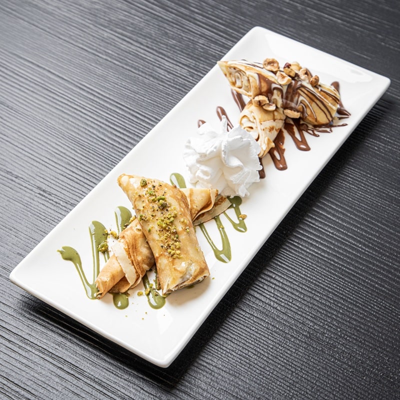 A rolled up crepe filled with pastry cream set on pistachio syrup, topped with honey and pistachio crumbs, paired with another rolled up crepe drizzled in Belgian and white chocolate, finished with a sprinkle of crushed hazelnut . Served with whipped cream on the side.