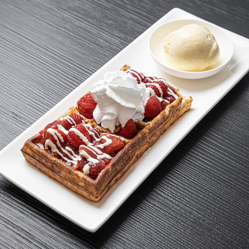 A waffle topped with strawberry coulis, fresh strawberries and drizzled with English cream. Served with a side of vanilla ice cream.