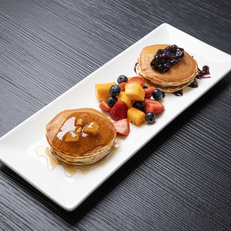 Three pancakes filled with Belgian chocolate, topped with Belgian and white chocolate. Three filled with pistachio paste, topped with pistachio syrup. Served with fresh mango, strawberries and blueberries.